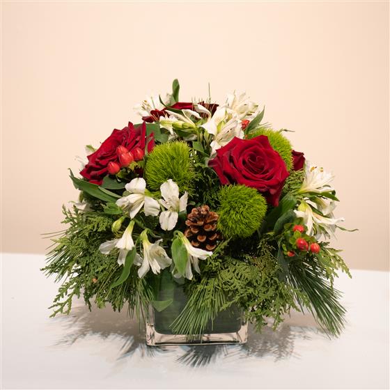 Perfect for any setting. A celebration of the finest Rosa Prima grown Explorer Roses, Alstroemeria, Berry, African Cones,