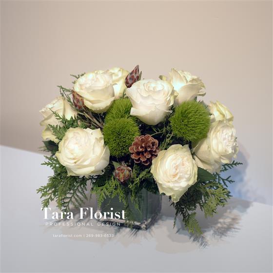 9 Large Headed Creamy White Mondial Roses, Cedar, Unique Cones imported from South Africa, Green Trick and special touches from the Tara Florist Design Team.