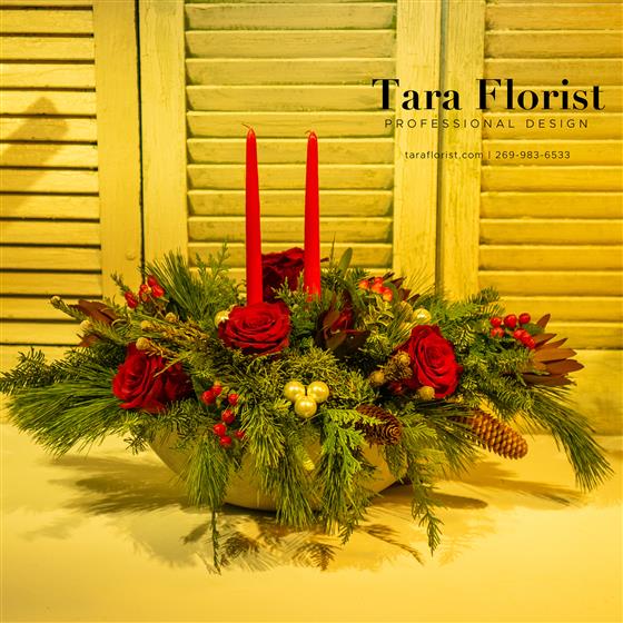 This arrangement includes 5 of our garden like RosaPrima Roses with Berries, Cones and Trim.
